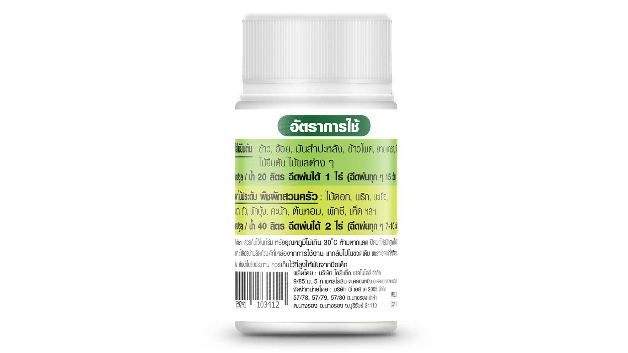 1 แคปซูล / น้ำ 20 ลิตร ฉีดพ่นได้ 1 ไร่ (ฉีดพ่นทุกๆ 15 วัน) 1 capsule / 20 liters of water, spraying 1 rai (spray every 15 days)